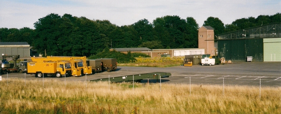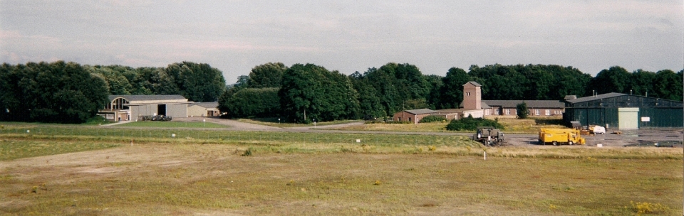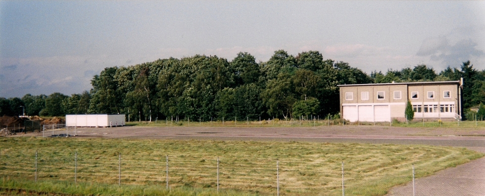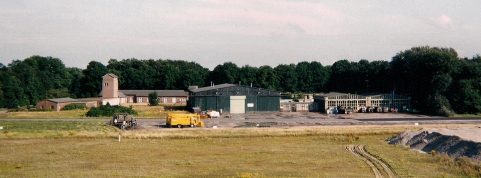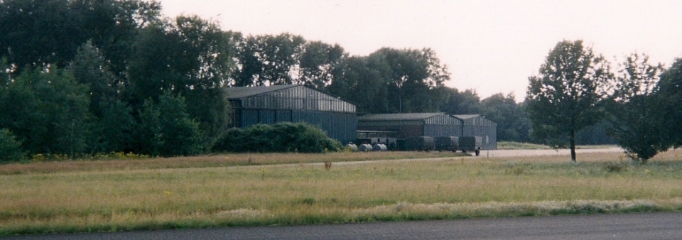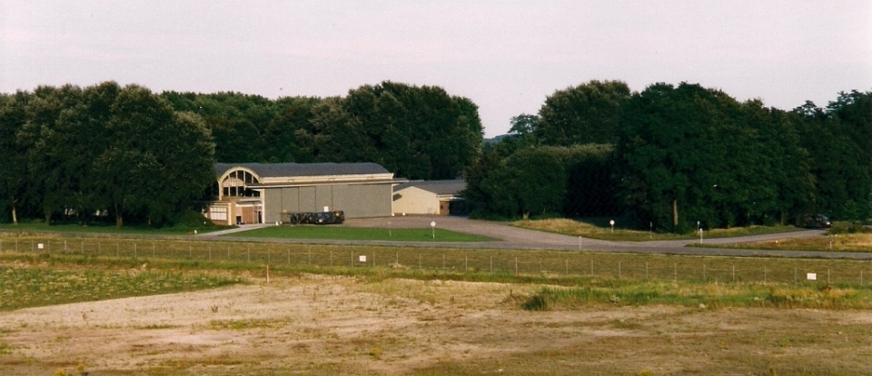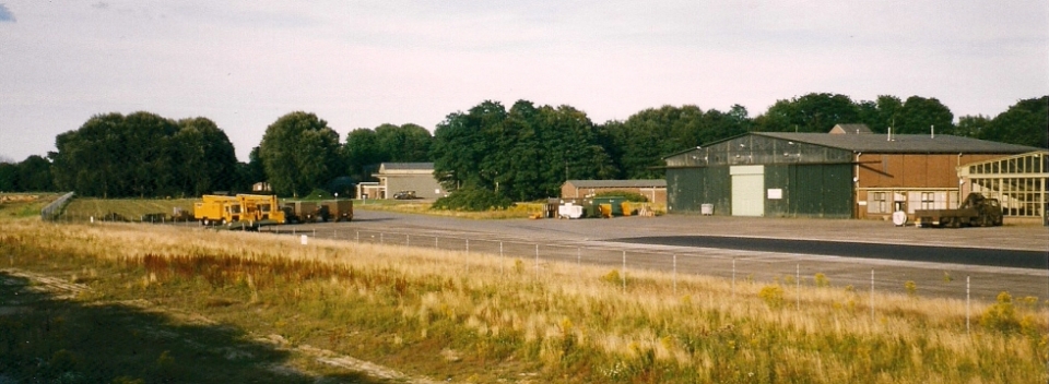 Hangar B en de daar pal vóór gelegen flightline zijn hier duidelijk te zien. Op de achtergrond zie je nog Hangar A. Hangar B was tijdens het maken van de foto niet meer in gebruik voor vliegtuigen, maar nog wel voor onderhoud en stalling van gronduitrusting. Om niet telkens de grote zware hangardeuren te hoeven openen was er in het midden een kleinere lichtkleurige roldeur aangebracht om voertuigen en aanhangwagens in en uit te laten rijden.