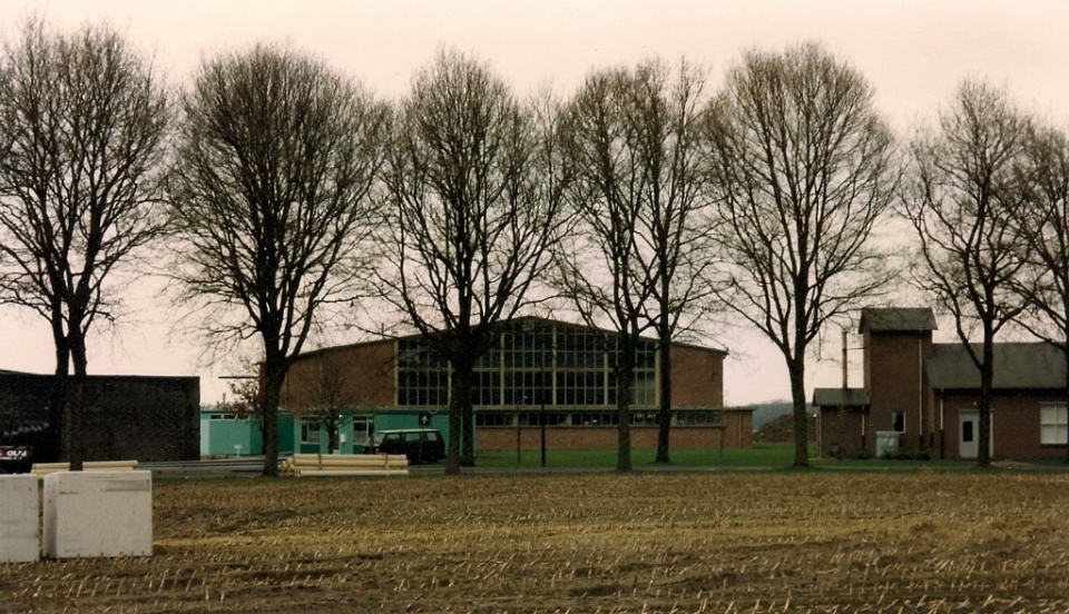 Gezien vanaf de oude spottersplek van baan 26 kijk je hier uit over het grote terrein van het oude vliegveld. Links van het midden zie je door de bomen vaag weerkaatsend zonlicht dat op de karakteristieke bogen van Hangar A schijnt. Rechts zie je duidelijk Hangar B. Hangar B huisde in de "NF-5 tijd" onder andere Eindhovens cross servicing. Als spotter kon je in het voorbij rijden eventuele bezoekende jachtvliegtuigen vóór deze hangar opgesteld zien staan. En zo kon een dagje spotten al heel snel extra spanning geven, hopend dat de geparkeerde bezoekers die middag nog zouden vertrekken.
