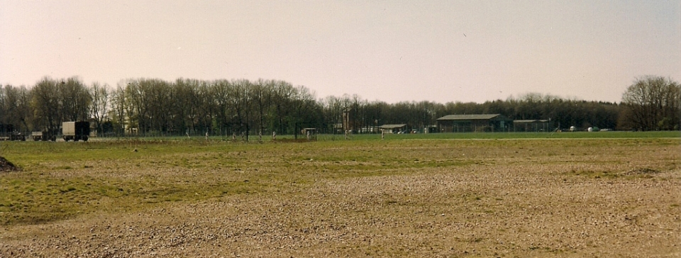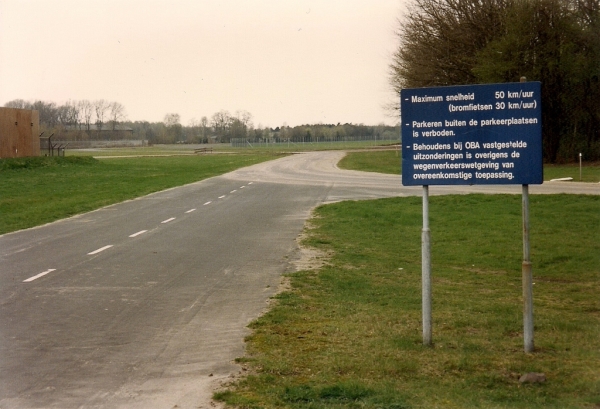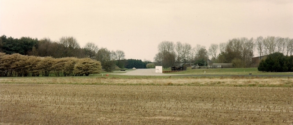 Gezien vanaf de zuidelijke poort van de vliegbasis kijk je hier min of meer uit over de oude Duitse noordwest/zuidoost baan. Die baan is later grotendeels opgebroken, maar bleef, met vernieuwd asfalt, lange tijd dienst doen als verbindende rolbaan tussen Hangar B en het nieuwere gedeelte van het vliegveld. De 315 Squadron flightline, met de bijnaam 'De Dijk', maakte onderdeel uit van die rolbaan. Links in beeld zie je de zijkant van Hangar C.