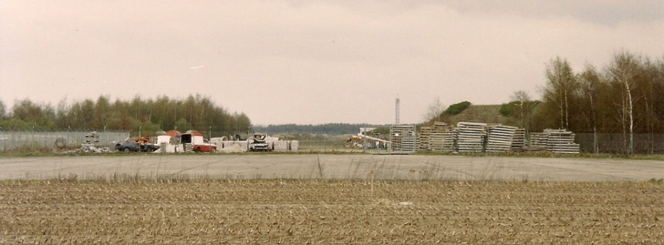 Als je wat verder naar rechts keek dan zag je in de verte Hangar C en rechts daarvan de flightline 'De Dijk'. Graafwerkzaamheden zijn hier nèt begonnen, getuige de rij zandheuveltjes en de graafmachine. Zoals te verwachten stootten graafmachinisten regelmatig op allerlei soorten bommen uit de tweede wereldoorlog. De Landmacht Explosieve Opruimingsdienst (EOD) kende in die tijd een bijna permanente aanwezigheid op en rond de vliegbasis. Met regelmaat moesten zij aan het werk om aangetroffen bommen op diverse manieren onschadelijk te maken.