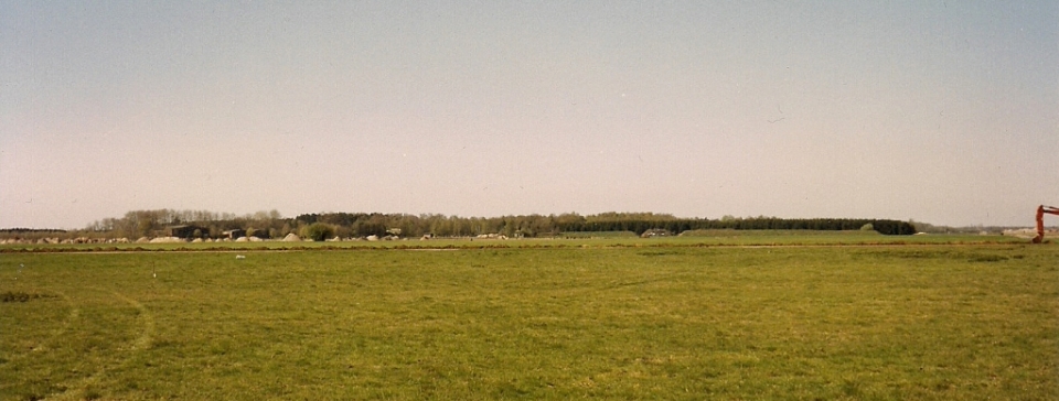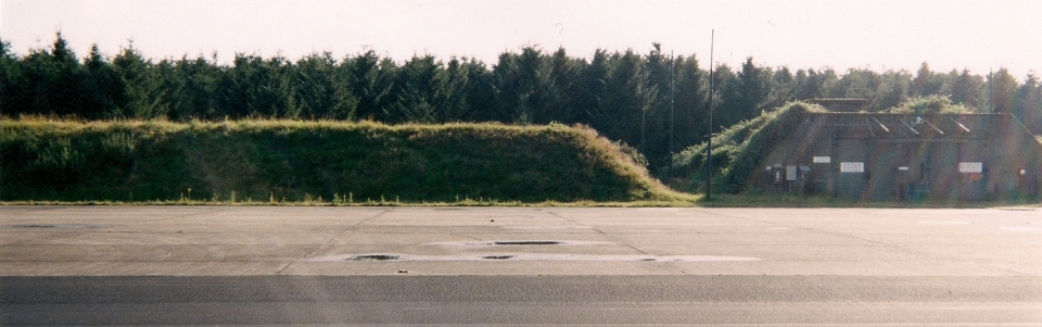 Op de volgende foto zie je de dijken en de bunker voor het grondpersoneel van dichtbij. De rolbaan was van zwart asfalt; de flightline zelf was van grijs beton. Op de foto zie je duidelijk de grens tussen deze twee gebruikte materialen. Tussen deze dijk en de - tevens op de foto zichtbare - boomgrens liep een rolbaan met zes dispersals.