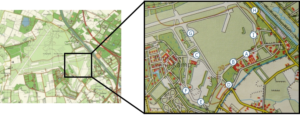 Rond het midden van het volgende kaartje van het terrein zie je een reeks zwarte letters: A t/m I.
